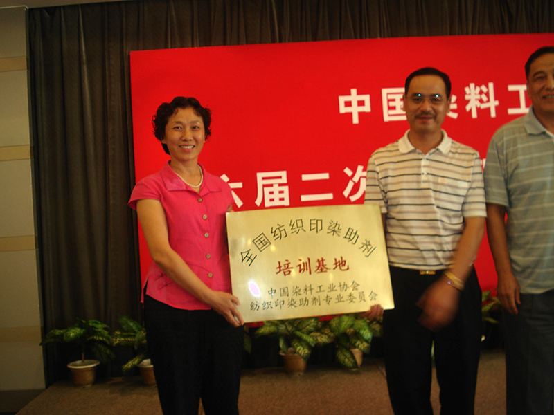 阮加春總經(jīng)理代表中國(guó)染料協(xié)會(huì)理事會(huì)頒發(fā)“全國(guó)紡織染料助劑培訓(xùn)基地”牌匾